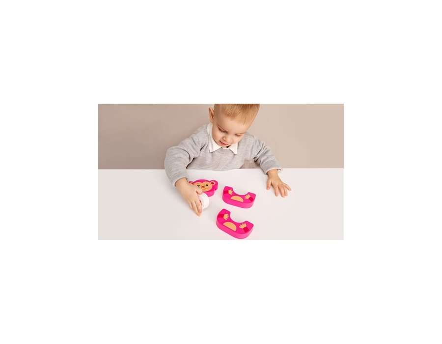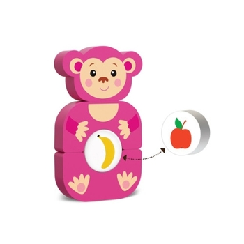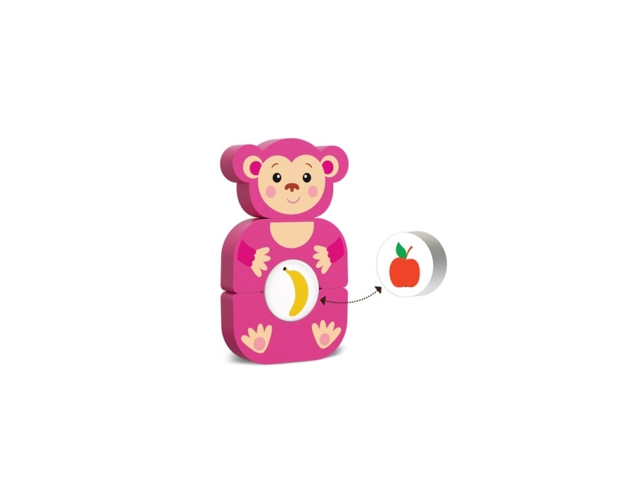 Cu această jucărie din lemn viu colorată, copiii vor adora să asambleze și să combine piesele și vor învăța, de asemenea, să gândească în afara tiparelor! Această maimuță distractivă este ușor de asamblat și foarte captivantă de jucat. Burtica reversibilă a maimuței vă permite să o „tratați” cu un măr sau o banană. Această jucărie promovează abilitățile motorii fine, coordonarea vizual-motorie și conștientizarea dimensiunii, oferind o experiență minunată celor mici care explorează lumea din jurul lor!