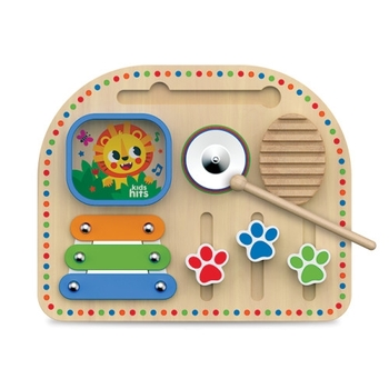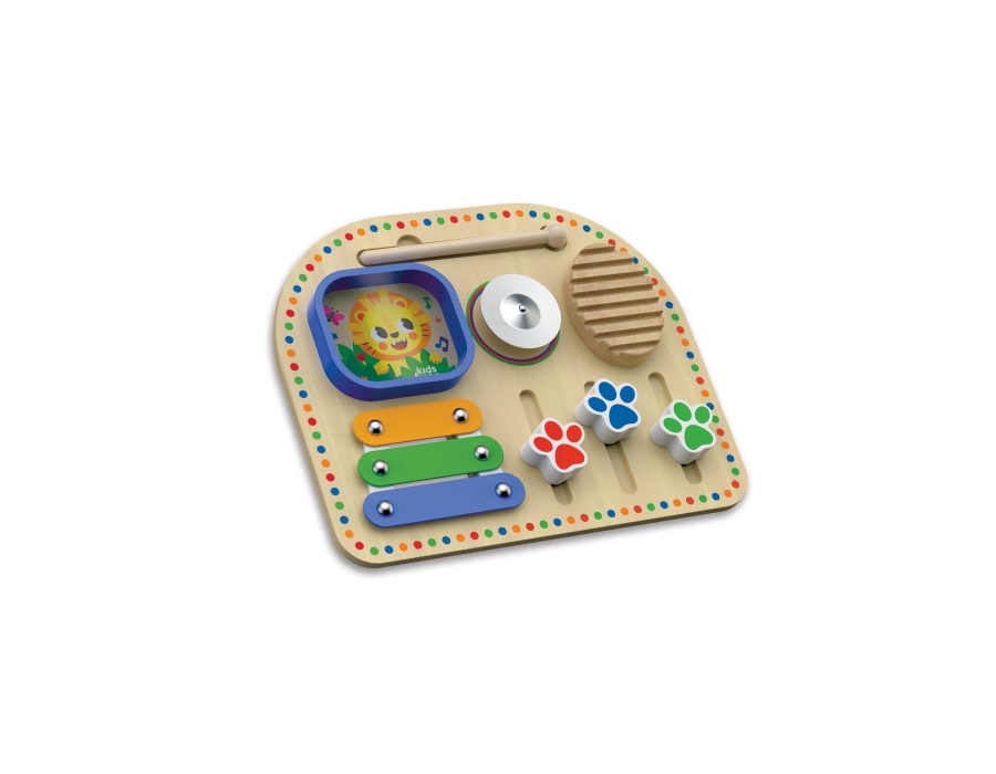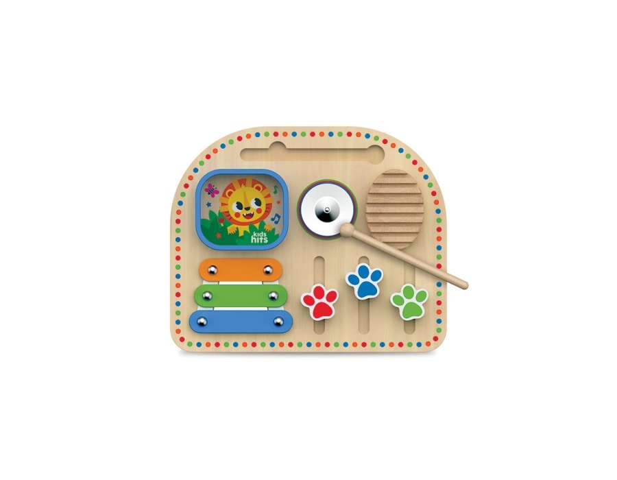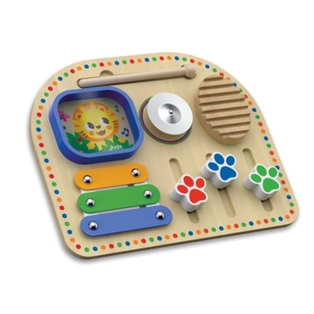 Această tablă muzicală multifuncțională va inspira tinerii muzicieni și va oferi ore întregi de improvizație captivantă! Xilofonul, zornăitoarea și cinelul creează o paletă sonoră bogată. Cântatul la aceste instrumente muzicale distractive cu un ciocan îi încurajează pe copii să exerseze diferite modele ritmice și să creeze primele lor melodii. Glisoare reale care pot fi mișcate în sus și în jos, texturi și materiale tactile, precum și culorile vibrante ale tablăi muzicale fac din jocul de neuitat! Creați muzică și deveniți un adevărat DJ!