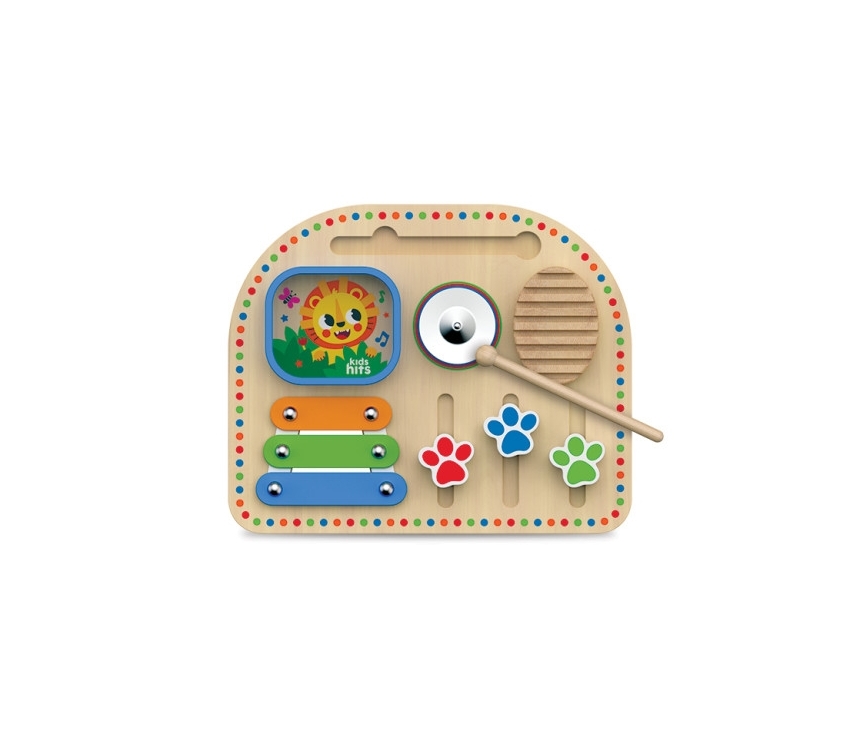 Această tablă muzicală multifuncțională va inspira tinerii muzicieni și va oferi ore întregi de improvizație captivantă! Xilofonul, zornăitoarea și cinelul creează o paletă sonoră bogată. Cântatul la aceste instrumente muzicale distractive cu un ciocan îi încurajează pe copii să exerseze diferite modele ritmice și să creeze primele lor melodii. Glisoare reale care pot fi mișcate în sus și în jos, texturi și materiale tactile, precum și culorile vibrante ale tablăi muzicale fac din jocul de neuitat! Creați muzică și deveniți un adevărat DJ!