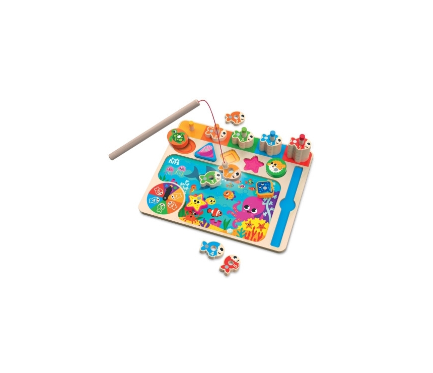 E timpul pescuitului! Jucăria de sortare Go Fishing este un joc distractiv de îndemânare, distractiv de jucat singur sau cu prietenii, în timp ce învață și culori de bază, forme și numărare. Învârte rotița și ai sarcina de a prinde o creatură marină! Jucătorii trebuie să prindă creaturi marine cu o undiță, apoi să folosească fantele de prindere și cuiele de sortare pentru a potrivi peștele cu culoarea potrivită. Ilustrațiile luminoase, elementele de sortare atractive și materialele ecologice pentru tablă permit copiilor să învețe despre lumea din jurul lor.