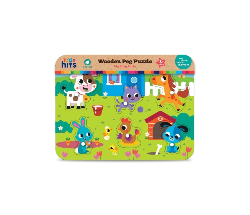 Acest puzzle colorat din lemn, cu placă perforată, este un joc distractiv cu animale drăguțe de fermă. Copiilor le va plăcea să potrivească piese simple de puzzle cu sloturile potrivite, urmând indiciile din imagini. „Ferma mea ocupată” dezvoltă logica și percepția vizuală la copiii mici.