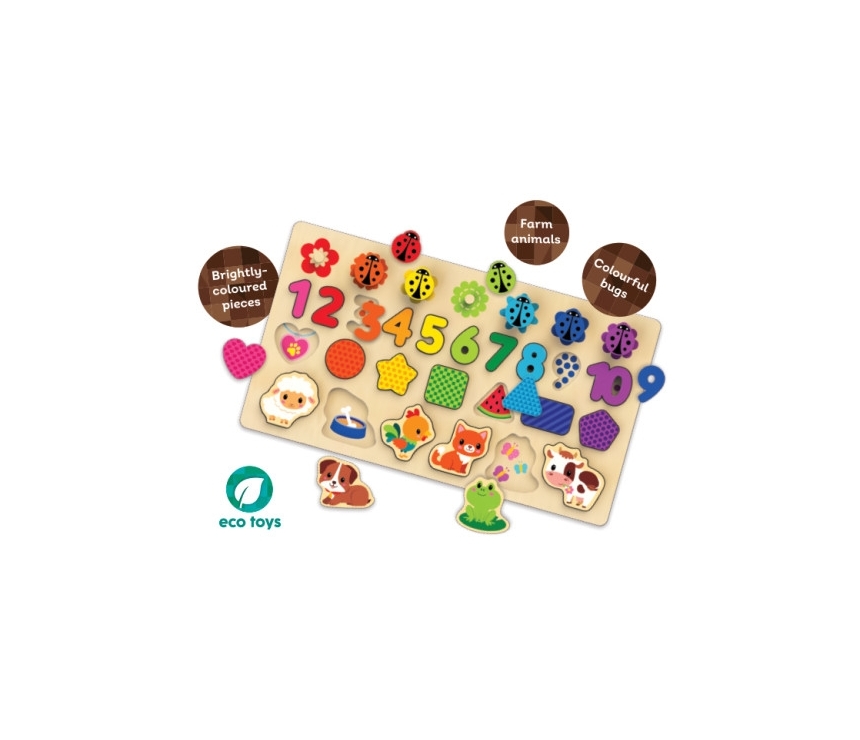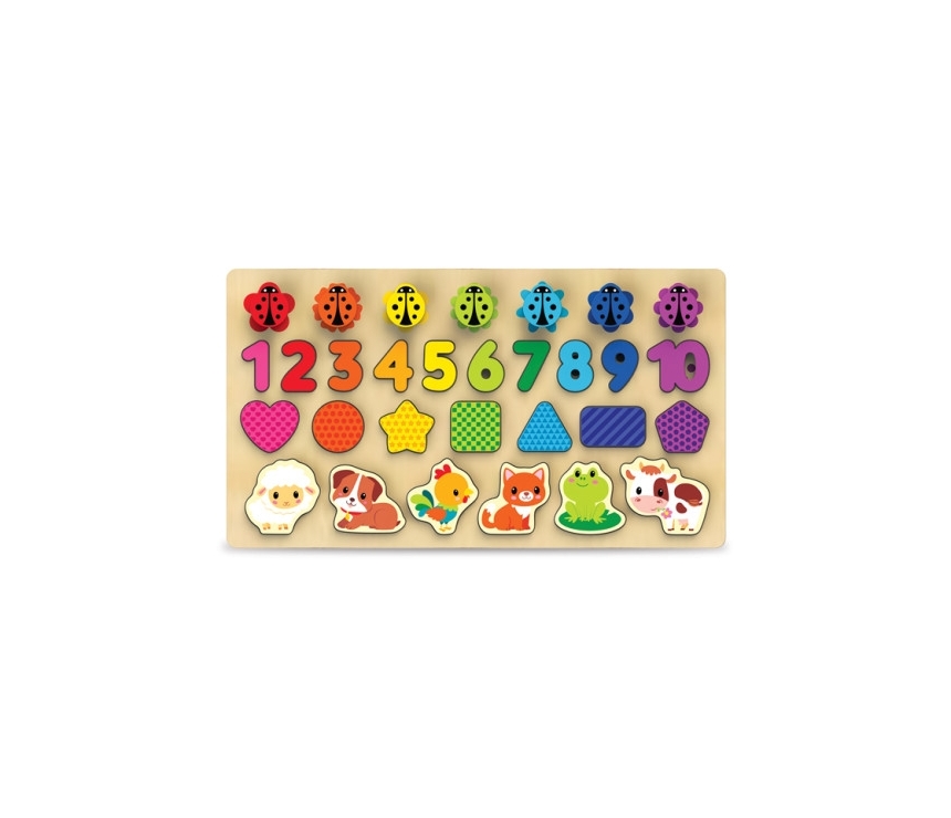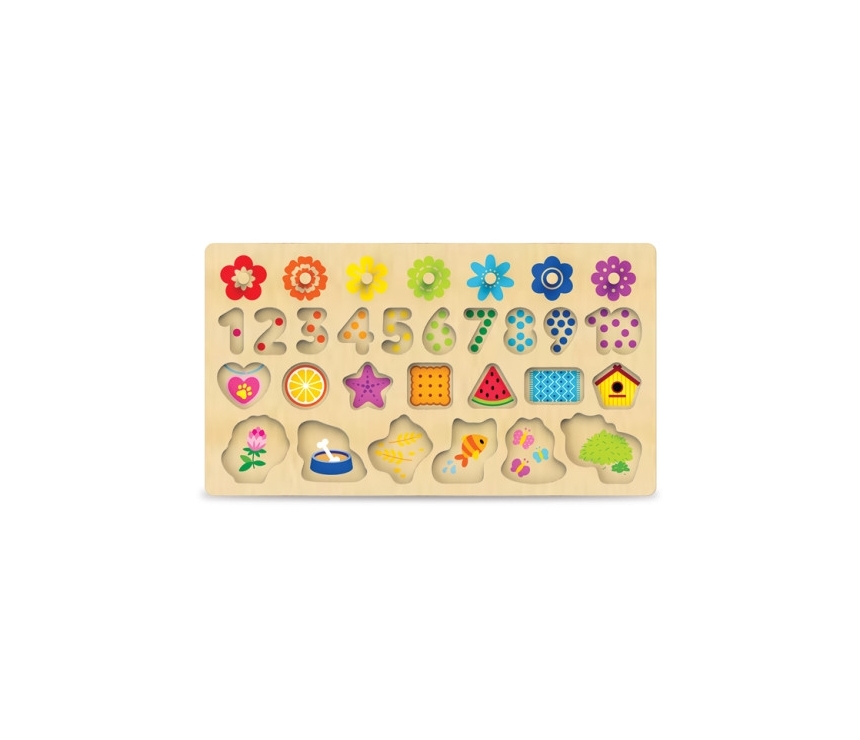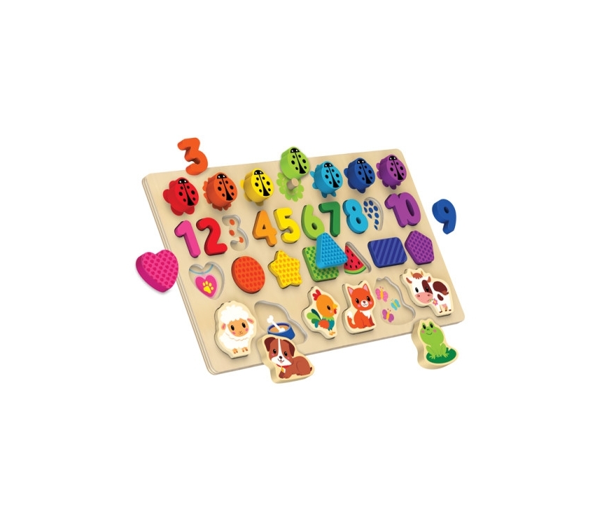 Puzzle-ul din lemn „Primele Lecții” este format din 30 de piese din lemn strălucitoare, durabile și practice, care prezintă numere, forme și imagini cu animale. Copiii vor potrivi imaginile din sloturi cu figurinele inserate și se vor bucura de jocul de sortare și numărare. Insectele colorate de pe tablă reprezintă cele 7 culori ale curcubeului și trebuie să își găsească locul pe o floare de aceeași culoare. Această jucărie educativă frumoasă și practică va asigura primele lecții de succes pentru micuții învățători!