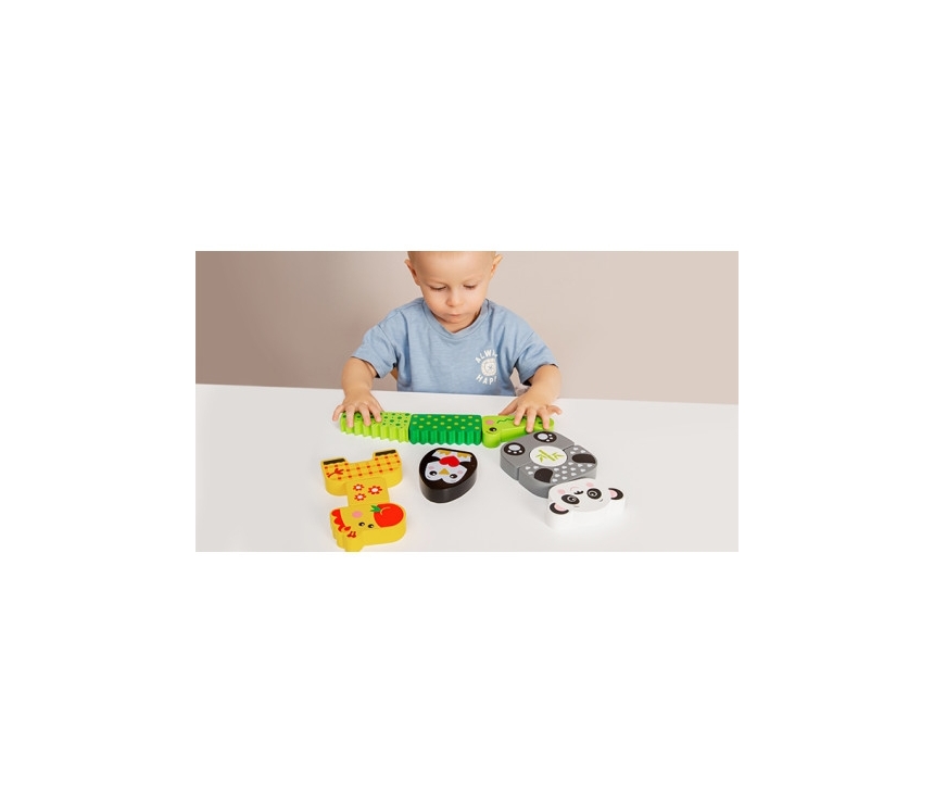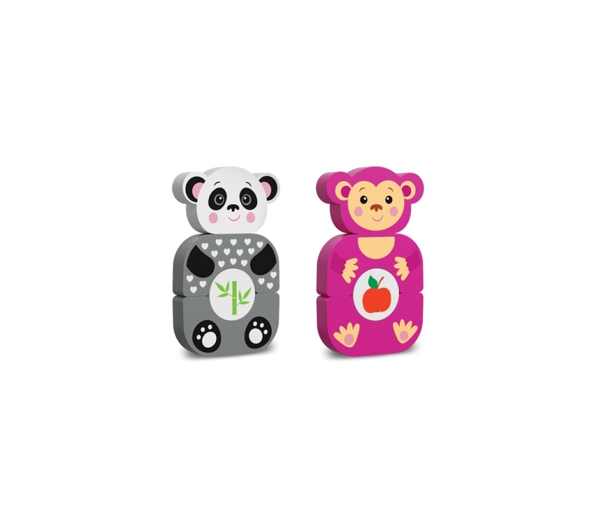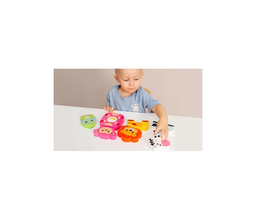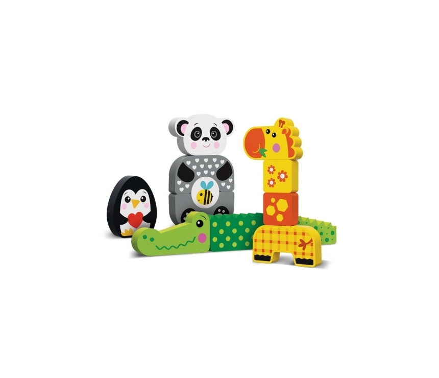 Copiilor le va plăcea cu siguranță acest set de blocuri de lemn! Figurinele vibrante sunt perfecte pentru a fi construite, potrivite și aranjate. O maimuță distractivă, o zebră dulce, un papagal vesel și un leu curajos - lăsați-i pe cei mici să-și construiască propria grădină zoologică! Acest set din lemn oferă copiilor o experiență senzorială minunată și încurajează dezvoltarea gândirii logice și a abilităților de rezolvare a problemelor prin joc. E timpul să faceți primele descoperiri!