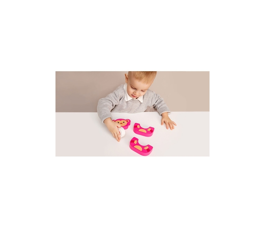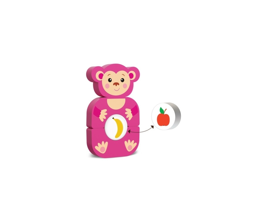 Cu această jucărie din lemn viu colorată, copiii vor adora să asambleze și să combine piesele și vor învăța, de asemenea, să gândească în afara tiparelor! Această maimuță distractivă este ușor de asamblat și foarte captivantă de jucat. Burtica reversibilă a maimuței vă permite să o „tratați” cu un măr sau o banană. Această jucărie promovează abilitățile motorii fine, coordonarea vizual-motorie și conștientizarea dimensiunii, oferind o experiență minunată celor mici care explorează lumea din jurul lor!