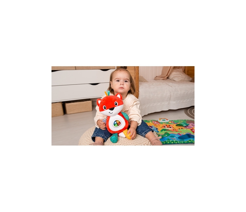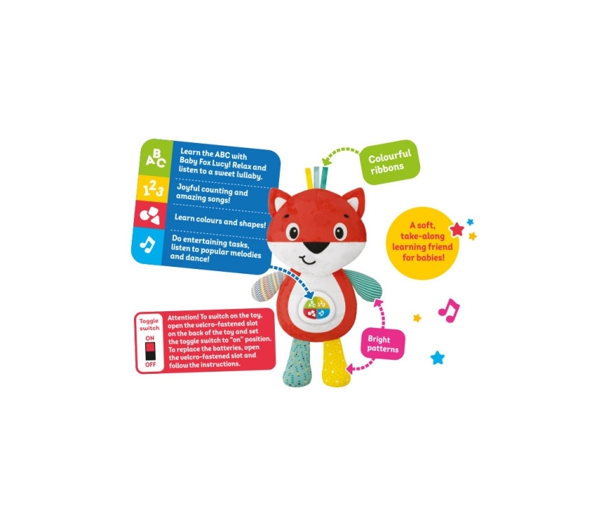 Această jucărie muzicală de pluș moale, cu modele colorate și lumini strălucitoare pe burtica strălucitoare, este gata să-ți implice bebelușul într-un joc plin de bucurie și activități educative. Apăsând cele patru butoane de pe burtică, bebelușul va asculta cântece și poezii amuzante, va îndeplini sarcini distractive și, în același timp, va învăța alfabetul și numărătoarea, dobândind primele cunoștințe despre forme și culori! Vulpea Lucy îi va introduce bebelușului saluturile prietenoase și bunele maniere și îi va cânta și un cântec de leagăn blând!